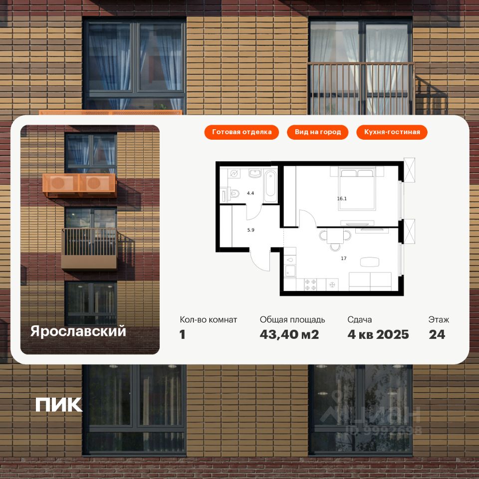 Продаётся 1-комн. квартира площадью 43,4 кв.м на 24 этаже 25 этажного дома (Корпус 16.1, Секция 1) проекта ПИК Ярославский. Светлый просторный подъезд на уровне земли, функциональная планировка, большие окна, c отделкой.