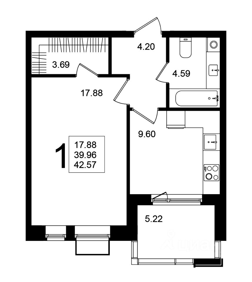 Продаётся 1-комнатная квартира в строящемся доме (Корпус 6), срок сдачи: 4-кв. 2025, общей площадью 42.57 кв.м., на 3 этаже.