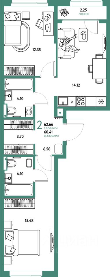 Продаётся 2-комнатная квартира в строящемся доме (Дом Перов), срок сдачи: III-кв. 2026, общей площадью 62.66 кв.м., на 12 этаже. Многоэтажные жилые дома с объектами инфраструктуры, расположенные по адресу: Московская область, г.о. Мытищи, г.Мытищи, мкр. 18Б, ул. Комарова.