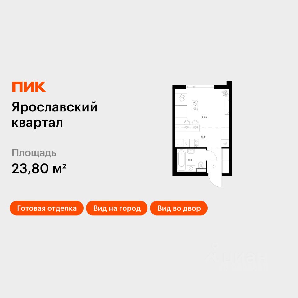 Продаётся квартира-студия площадью 23,8 кв.м на 24 этаже 25 этажного дома (Корпус 2.4, Секция 1) проекта ПИК Ярославский квартал. Светлый просторный подъезд на уровне земли, функциональная планировка, большие окна, c отделкой.