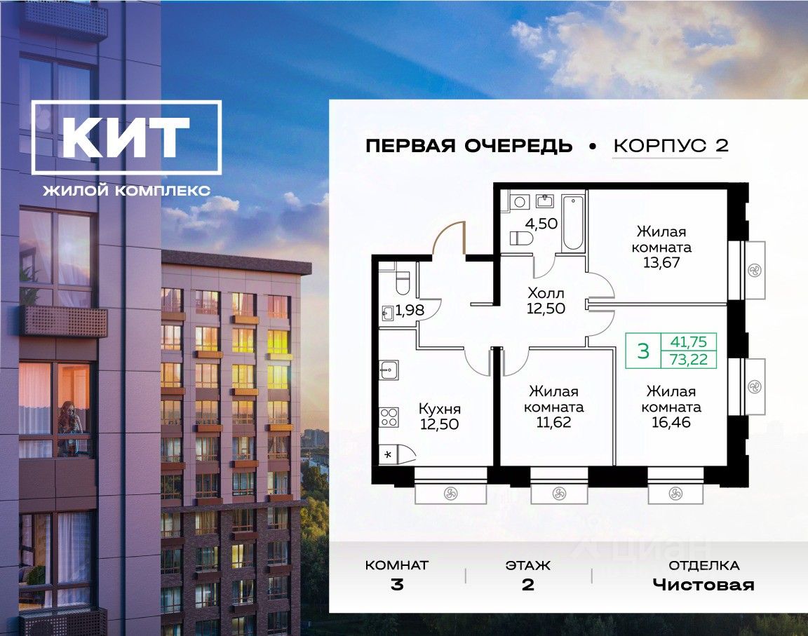 Продаётся 3-к квартира 73.2 кв.м. с чистовой отделкой в ЖК ''КИТ'' на 2-м этаже 25 этажного дома. Жилой комплекс ''Кит'' спроектирован в урбанистической концепции ''Город в Городе''. Объект бизнес-класса предлагает рациональный подход к набору опций, необходимых для гармоничной жизни. Проект представляет собой два корпуса, которые образуют единую приватную территорию. Ее доминантой является двор с красивым ландшафтным дизайном и различными зонами, ориентированными на интересы жителей разного возраста. При создании пространства в приоритет ставился комфорт жителей. В шаговой доступности находятся торговый центр, рестораны, кинотеатры, спортивный зал, образовательные учреждения и много других сфер услуг.