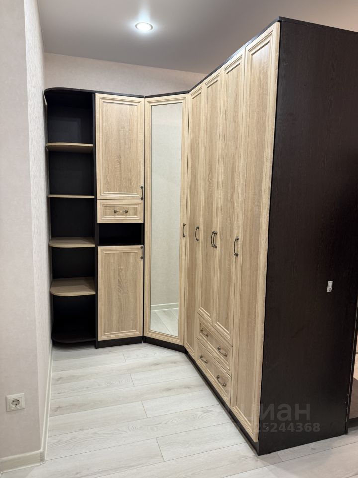 Вместительный угловой шкаф с зеркалом отделяет зону прихожей от жилой комнаты. Есть кровать.
