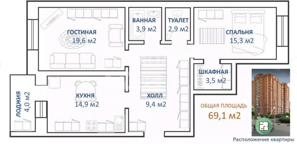 Функциональная планировка квартиры включает: - просторный холл (9,4 кв.м), - 2 изолированные комнаты (19,6 и 15,3 кв.м), выходящие на внутреннюю и внешнюю стороны дома, - гардеробную в спальне (3,5 кв.м), - большую кухню (15 кв.м), соединенную с застекленной лоджией (4кв.м) с панорамными видами.