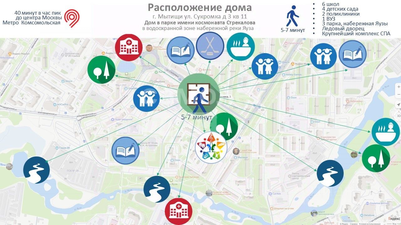 В 5 минутах от дома благоустроенная набережная реки Яуза с прогулочными зонами, детскими площадками, велодорожками.