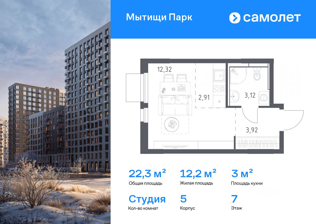 Строим кварталы для жизни с заботой о будущем. Предлагается квартира студия комфорт-класса 22,27 кв.м в корпусе 5 на 7 этаже, в ЖК ''Мытищи Парк''