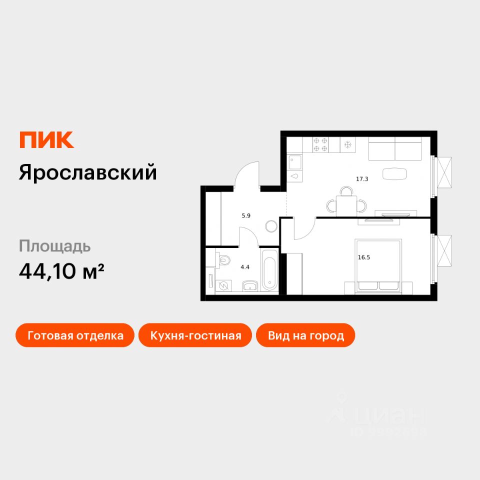 Продаётся 1-комн. квартира площадью 44,1 кв.м на 14 этаже 25 этажного дома (Корпус 16.2, Секция 2) проекта ПИК Ярославский. Светлый просторный подъезд на уровне земли, функциональная планировка, большие окна, c отделкой.