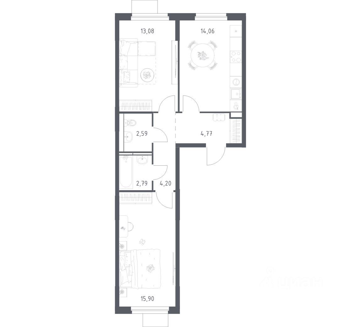 Общая площадь57,39 м2