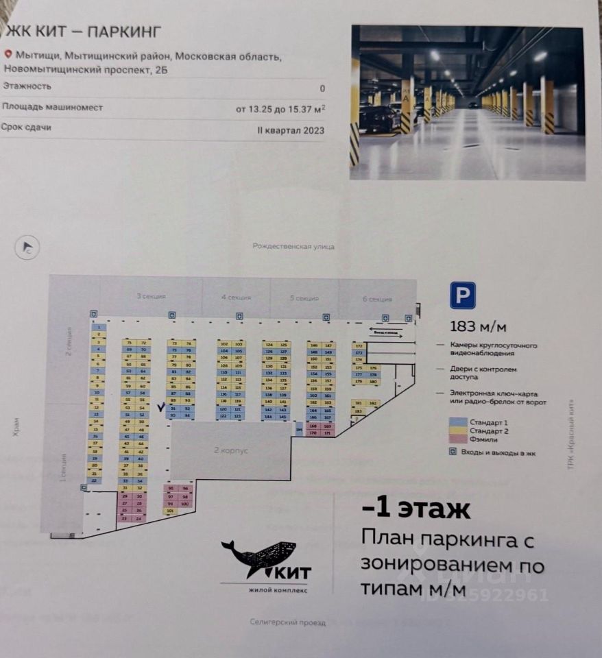 Продаётся машиноместо площадью 13,3 м² в подземном паркинге ЖК КИТ (1 этаж).