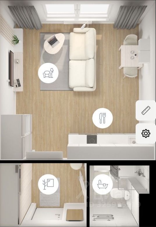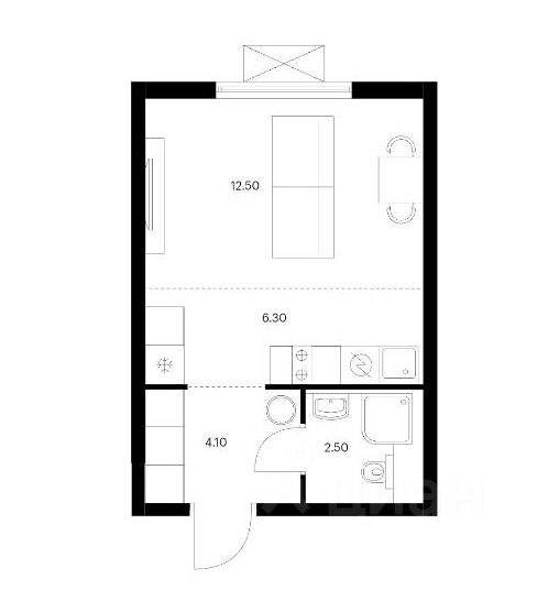2. Удачная планировка (не вагон) + Вид Общая площадь 25.4 м². Главный плюс — геометрия квартиры. Она широкая, а не вытянутая пеналом. • Зона хранения: Просторный коридор позволяет установить огромный встроенный шкаф (до 4-х метров). Весь визуальный шум убирается туда, комната остается свободной. • Зонирование: Жилая зона 12.5 м², выделенная зона кухни 6.3 м². • Окна во двор: Принципиальный момент. Окна выходят в противоположную сторону от железной дороги. В квартире будет тихо, поездов не слышно и не видно.