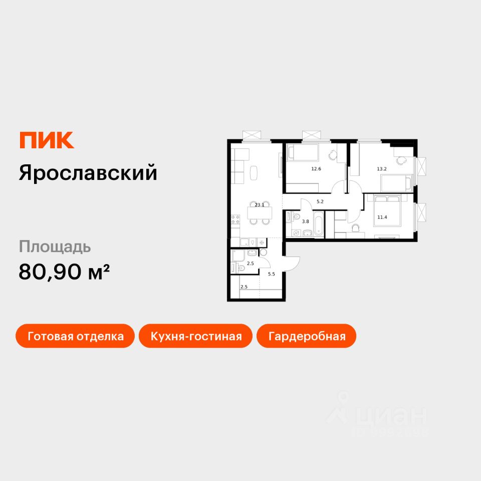 Продаётся 3-комн. квартира площадью 80,9 кв.м на 23 этаже 25 этажного дома (Корпус 16.2, Секция 2) проекта ПИК Ярославский. Светлый просторный подъезд на уровне земли, функциональная планировка, большие окна, c отделкой.