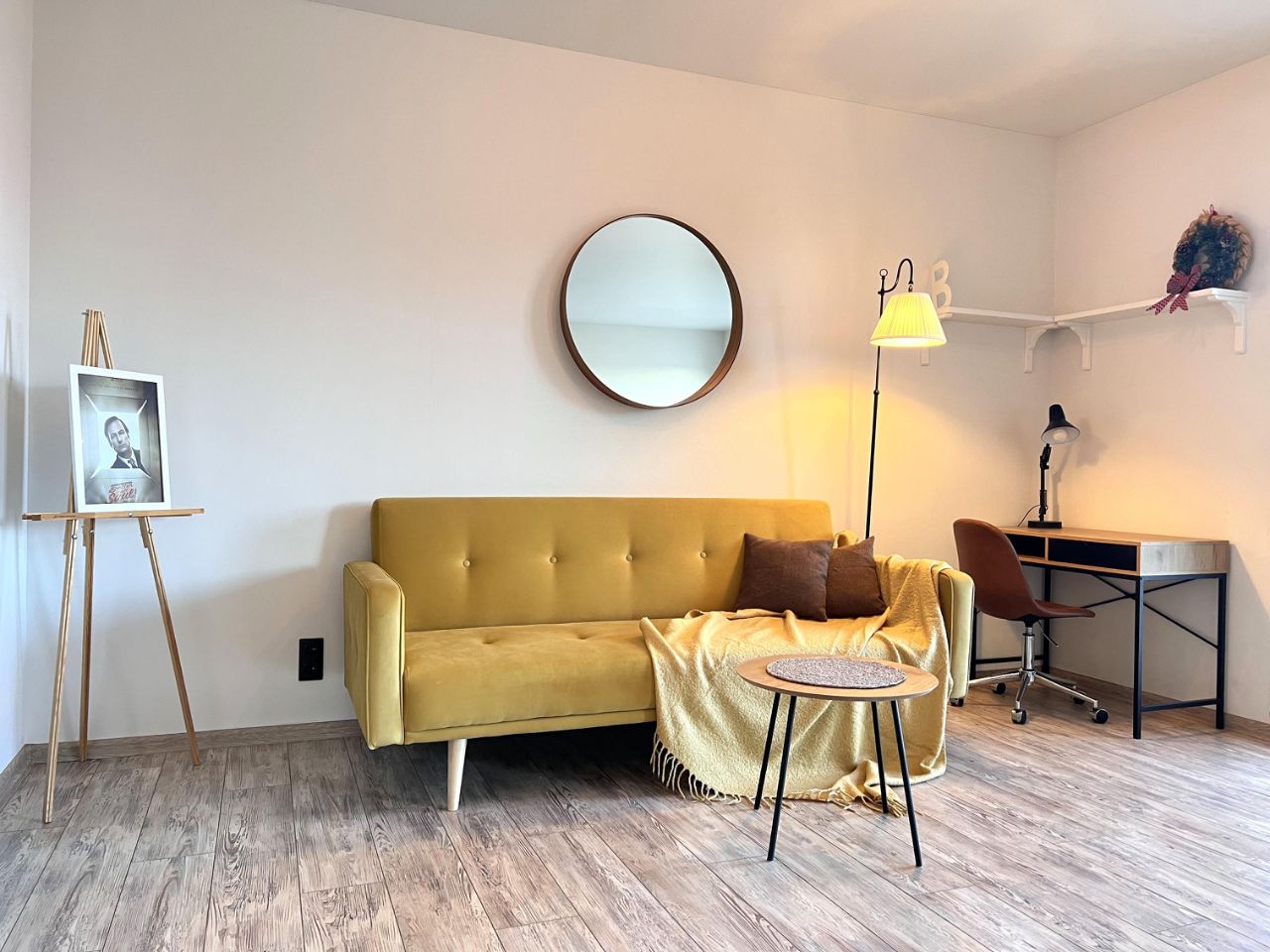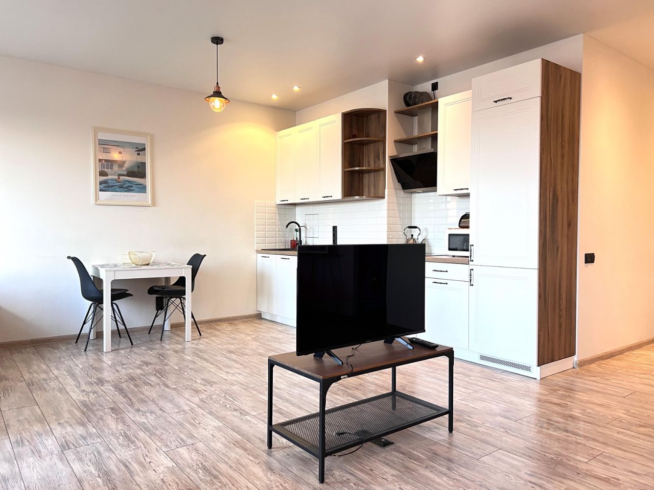 В зоне комнаты удобный раскладывающийся диван, кондиционер, витрина. Кухонная зона со всей необходимой бытовой техникой (холодильник, варочная панель, духовой шкаф, ПММ, микроволновая печь, вытяжка), кухонный стол со стульями. В спальной зоне двуспальная кровать с ортопедическим матрасом и подъемным механизмом. Туалетный столик. Установлен кондиционер.