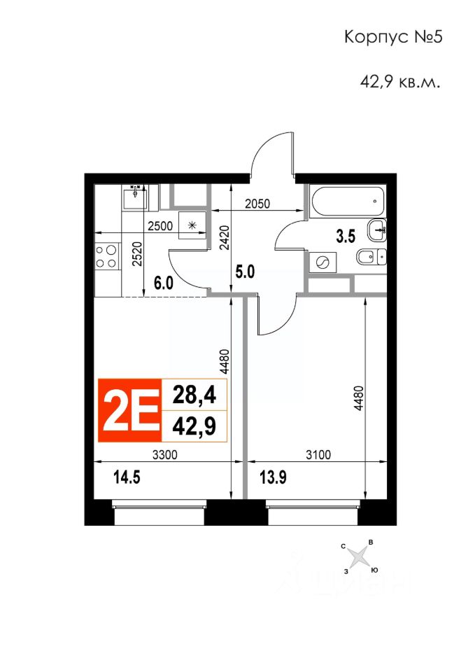 Продаётся 2-комнатная квартира в строящемся доме (Корпус 5), срок сдачи: II-кв. 2026, общей площадью 42.9 кв.м., на 6 этаже. Многоквартирный жилой дом со встроенно-пристроенными нежилыми помещениями и автостоянкой