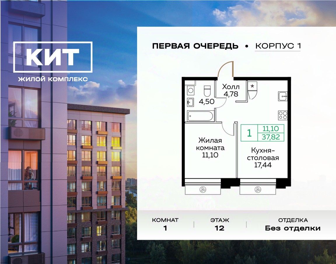Продаётся 1-к квартира 37.9 кв.м. без отделки в ЖК ''КИТ'' на 12-м этаже 25 этажного дома. Жилой комплекс ''Кит'' спроектирован в урбанистической концепции ''Город в Городе''. Объект бизнес-класса предлагает рациональный подход к набору опций, необходимых для гармоничной жизни. Проект представляет собой два корпуса, которые образуют единую приватную территорию. Ее доминантой является двор с красивым ландшафтным дизайном и различными зонами, ориентированными на интересы жителей разного возраста. При создании пространства в приоритет ставился комфорт жителей. В шаговой доступности находятся торговый центр, рестораны, кинотеатры, спортивный зал, образовательные учреждения и много других сфер услуг.