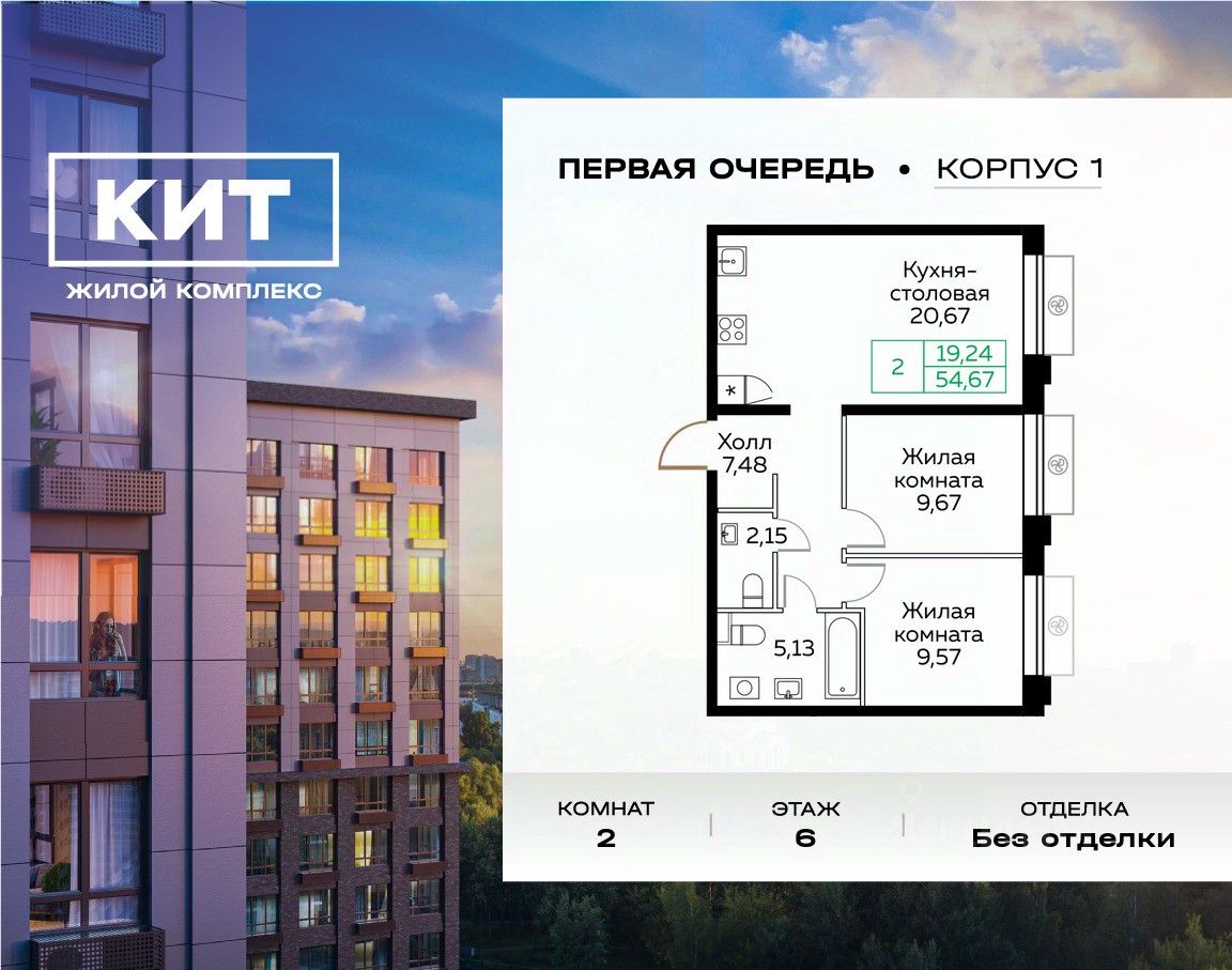 Продаётся 2-к квартира 54.7 кв.м. без отделки в ЖК ''КИТ'' на 6-м этаже 25 этажного дома. Жилой комплекс ''Кит'' спроектирован в урбанистической концепции ''Город в Городе''. Объект бизнес-класса предлагает рациональный подход к набору опций, необходимых для гармоничной жизни. Проект представляет собой два корпуса, которые образуют единую приватную территорию. Ее доминантой является двор с красивым ландшафтным дизайном и различными зонами, ориентированными на интересы жителей разного возраста. При создании пространства в приоритет ставился комфорт жителей. В шаговой доступности находятся торговый центр, рестораны, кинотеатры, спортивный зал, образовательные учреждения и много других сфер услуг.