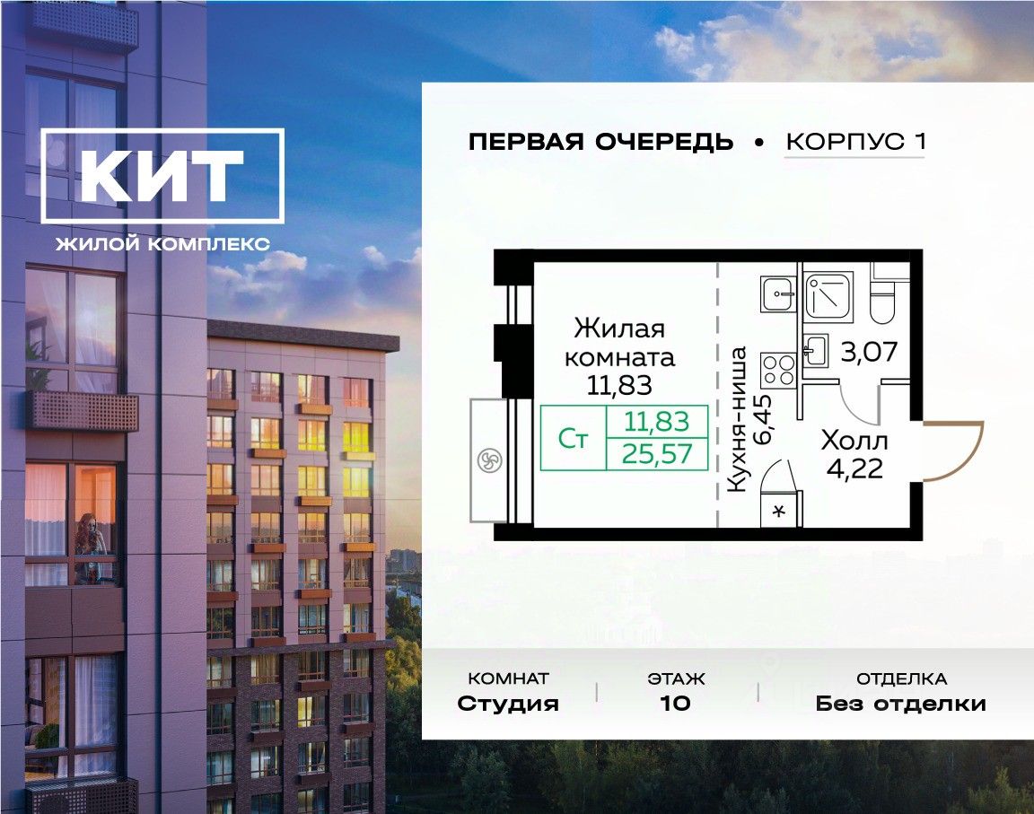 Продаётся студия 25.5 кв.м. без отделки в ЖК ''КИТ'' на 10-м этаже 25 этажного дома. Жилой комплекс ''Кит'' спроектирован в урбанистической концепции ''Город в Городе''. Объект бизнес-класса предлагает рациональный подход к набору опций, необходимых для гармоничной жизни. Проект представляет собой два корпуса, которые образуют единую приватную территорию. Ее доминантой является двор с красивым ландшафтным дизайном и различными зонами, ориентированными на интересы жителей разного возраста. При создании пространства в приоритет ставился комфорт жителей. В шаговой доступности находятся торговый центр, рестораны, кинотеатры, спортивный зал, образовательные учреждения и много других сфер услуг.