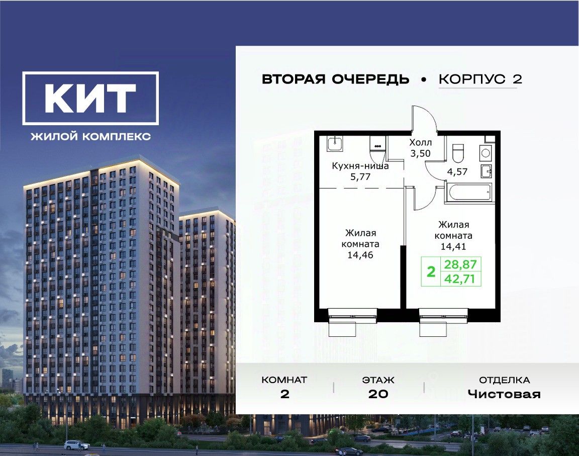 Продаётся 2-к квартира 42.71 кв.м. с чистовой отделкой в ЖК ''КИТ2'' на 20-м этаже 25 этажного дома.Жилой комплекс ''Кит 2'' спроектирован в урбанистической концепции ''Город в Городе''. Объект бизнес-класса предлагает рациональный подход к набору опций, необходимых для гармоничной жизни. Проект представляет собой два корпуса, которые образуют единую приватную территорию. Ее доминантой является двор с красивым ландшафтным дизайном и различными зонами, ориентированными на интересы жителей разного возраста. При создании пространства в приоритет ставился комфорт жителей. В шаговой доступности находятся: торговый центр, рестораны, кинотеатры, спортивный зал, образовательные учреждения и множество других объектов в сфере услуг.