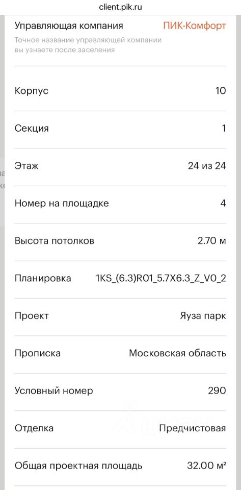Корпус 10, секция 1 Этаж: 24 из 24 Общая площадь: 32,0 м² Срок передачи ключей: 4 квартал 2027 года Отделка: предчистовая (white box) Высота потолков: 2,7 м