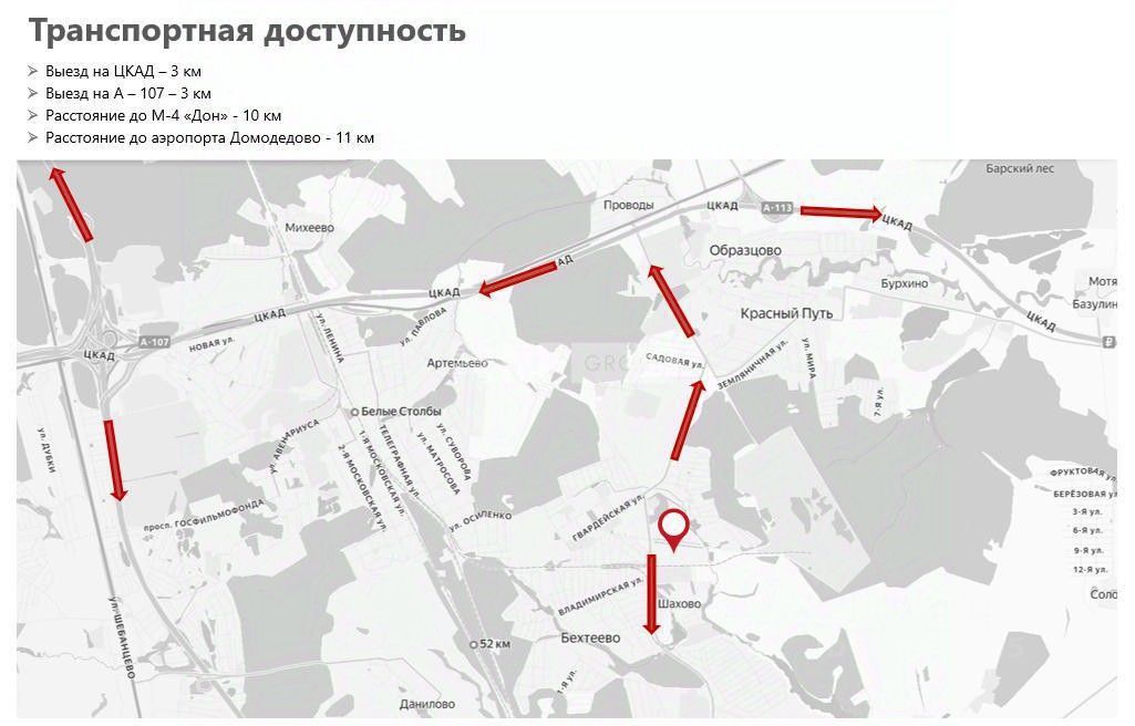 Расположение Объект находится в Москве, ЮАО, вблизи трассы М-4 ''Дон'', в 30 км от МКАД. Удалённость: 3 км до ЦКАД, 3 км до А-107, 10 км до М-4 ''Дон'', 11 км до аэропорта Домодедово.
